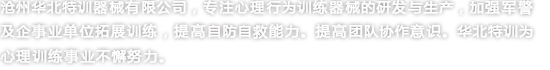 滄州華北特訓(xùn)器械有限公司成立于2002年,是專業(yè)研發(fā)生產(chǎn)心理行為訓(xùn)練器械、拓展器械、拓展器材、攀巖、兒童拓展器械的專業(yè)型企業(yè),并通過ISO-9001質(zhì)量管理體系認(rèn)證及ISO-14001環(huán)境管理體系認(rèn)證,致力于各職業(yè)群體提供的心理行為訓(xùn)練器械、拓展器械、攀巖、兒童拓展器械等設(shè)備,使之不斷提升心理健康水平、充分開發(fā)自我潛能。我公司竭誠為廣大客戶提供專業(yè)化各類心理行為訓(xùn)練器械相關(guān)產(chǎn)品和服務(wù)。
